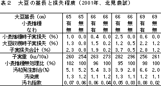 望ましい(表2)。また、大豆畦間に生育する小麦が大豆汚粒発生の原因になる可能性は低い。