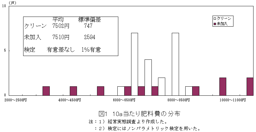 2)クリーン経営群と未加入経営群の10a当たりの肥料費を比較したところ、分布の中央値に
