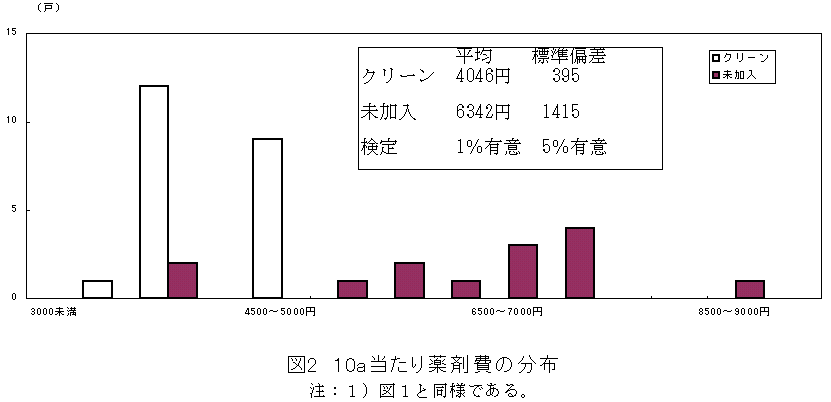 3)クリーン経営群と未加入経営群の10a当たりの薬剤費を比較したところ、分布の中央値と