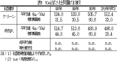 出荷量には、差が生じていない(表1)。以上から、集団的対応による水稲クリーン栽培は、