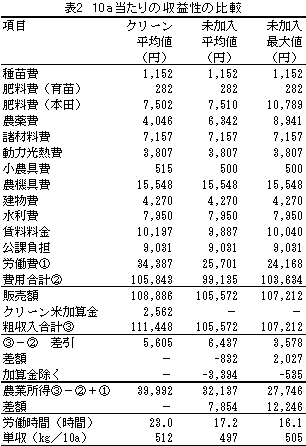 導入に伴う所得増効果を確認できる(表2)。加算金に見られるように、水稲クリーン栽培の実践は、