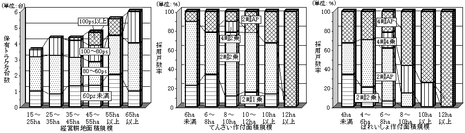 | 図1 経営耕地面積規模別の トラクタ保有状況 | 図2 てんさい作付面積規模別の 採用移植機 | 図3 ばれいしょ作付面積 規模別の採用播種機 |