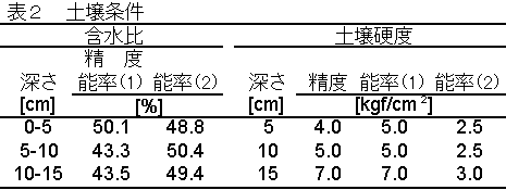 2) 作業精度・能率試験(1)では表面の土壌硬度が4.0〜5.0kgf/cm2,能率試験(2)では2.5kgf/cm2と