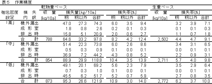 なる(表5)。損失は作物が成形室内でスチールロール間の隙間から成形室下部へ漏下して生じる。