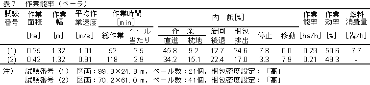 であった(表7)。試験番号(1)で回収作業に用いた自走式ベールラッパの処理能力はベール1個当たり