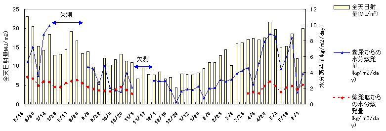 と、堆積発酵の二次施設からなる現地実証施設において、蒸発量の多い春〜夏季は