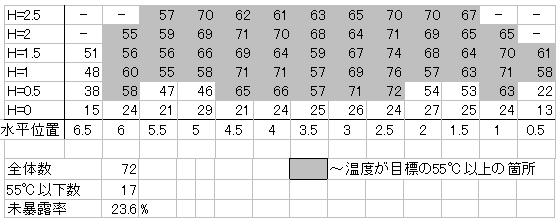 わずかな面積を部分加温する事により、堆積糞尿全体を発熱発酵させる事が可能であった(表1)。