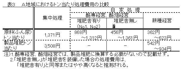 割高である(表3)。費用負担に関する考え方の改善点として、処理費用は畜産経営と耕種経営の