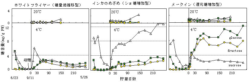 増加するが,糖変動には品種間差がある。本研究では,生育および貯蔵中の糖変動の