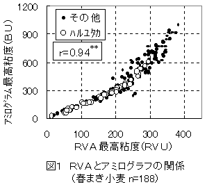 1)RVA最高粘度とアミログラム最高粘度の間に高い正の相関関係が認められ、RVAは