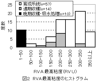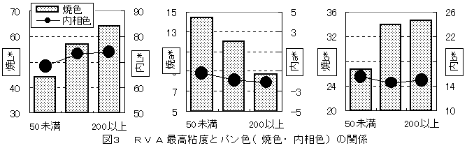やや低かった(図3)。このように、最高粘度が低いものは、焼色が濃くなり、内相色が暗くなる