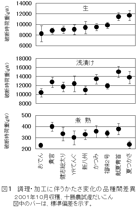2)生、浅漬け後および煮熟後のディスク試料の破断時荷重を測定した結果、品種間に有意な差異が