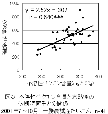 破断時荷重と不溶性ペクチン含量には高い相関が認められた(図3)。