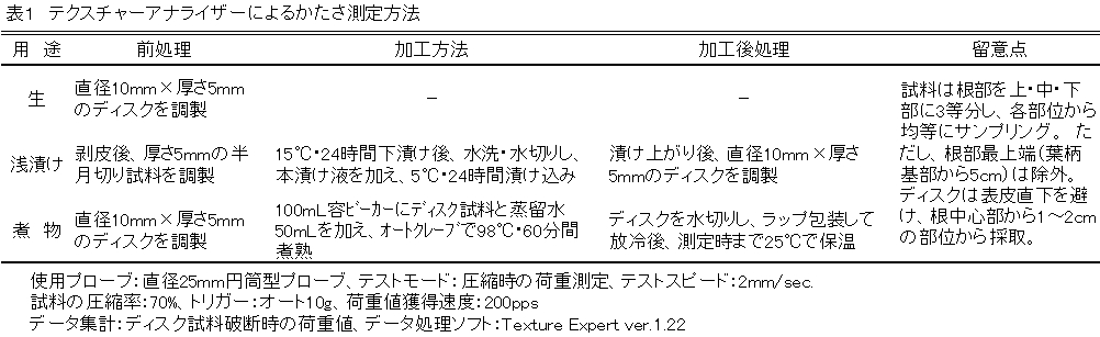 機器分析によるだいこんのテクスチャーおよび辛味の客観的評価法を、調理(煮物)および