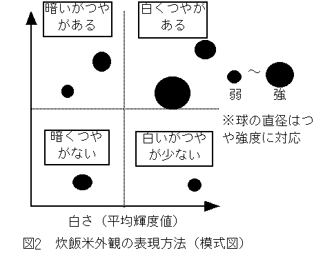 炊飯米外観の良否および質の違いを平面上にプロットし評価できる手法を考案した(図2)。