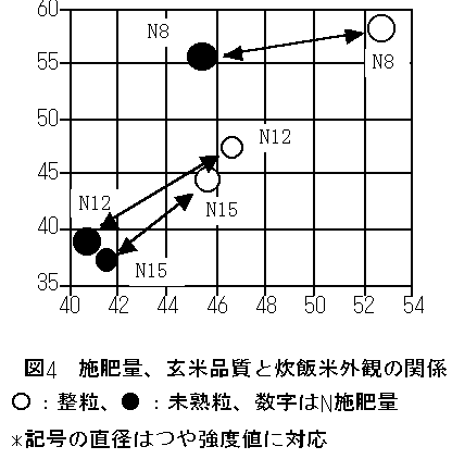 3)窒素施肥が過剰になると炊飯米の外観は劣る事が数値的に確認された。また、玄米品質との