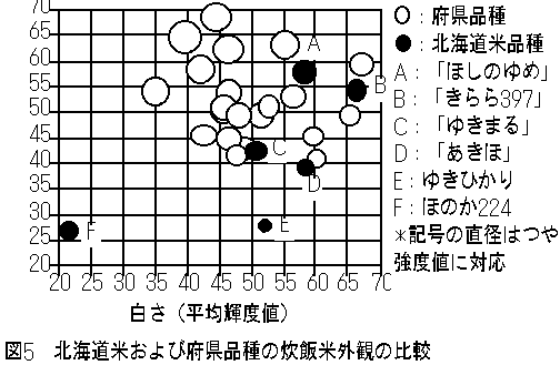 2)北海道米の炊飯米外観測定を試みたところ、品種の食味ランクとほぼ対応すると共に、品種毎の