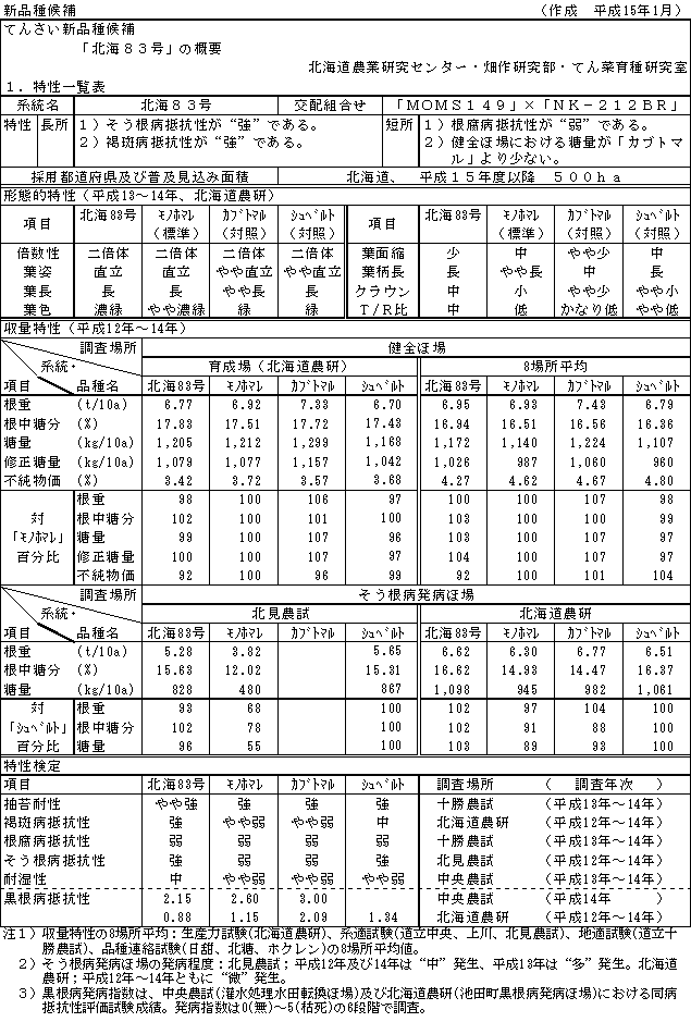 「北海83号」は、健全ほ場における根重並びに根中糖分が「シュベルト」より高く、不純物価が低い。耐病性に関しては複合抵抗性を有し、そう根病抵抗性並びに褐斑病抵抗性は“強”であり、黒根病発病ほ場において発病指数が「モノホマレ」より低い。また、耐湿性は“中”である。
