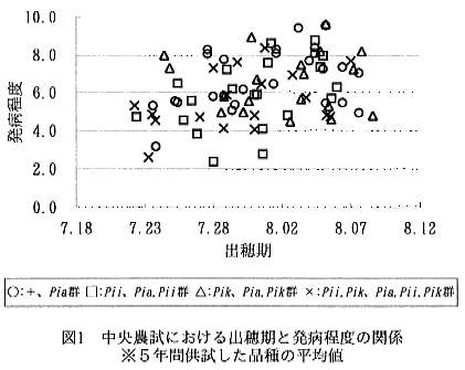 1)中央農試では、5ヶ年の試験において、各品種の出穂期と発病程度には緩やかな正の相関関係が認められた(図1)。