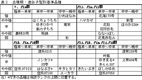 上川農試においても穂いもち検定を実施し、中央農試との整合性を検討した上で、より普遍性の高い出穂期・遺伝子型別基準品種を選定する。