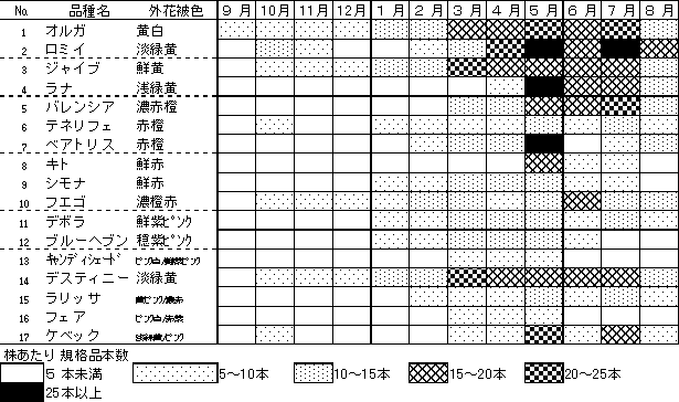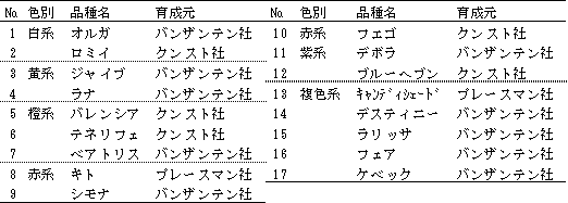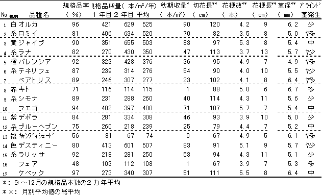 <試験Ⅰ> 白系では主要品種である「オルガ」が規格品率が高く、秋期収量も多く、花梗数、茎径等の切り花品質も優れていた。「ロミイ」は収量性は高かったが、規格品率がやや低く、切り花品質も劣っていた。黄系では「ジャイブ」が秋期収量に優れていた。花はやや小輪であり、花付きが良かった。「ラナ」は秋期収量が少なく、採花本数および品質の季節変動が大きすぎて実用的ではないと思われた。橙系では「テネリフェ」は総収量はあまり多くないが、秋期収量が比較的高く、切り花品質が安定していた。「バレンシア」は総収量は多かったが、秋期に採花できず、切り花品質もやや劣っていた。「ベアトリス」は花色がよく切り花品質に優れていたが、秋期収量が少なかった。赤系では「フエゴ」が秋期収量に優れ、切り花品質も優れていた。「シモナ」は収量性で「フエゴ」にやや劣り、切り花品質はばらつきが大きかった。「キト」は秋期開花性がなく収量も低いため、実用的ではないと思われた。紫系では「デボラ」の秋期収量が比較的高かったが、品質的には中庸であった。「ブルーヘブン」は花色に特徴があったが秋期収量は低く、切り花品質もやや劣った。複色系では「デスティニー」が「オルガ」並の秋期収量および切り花品質を示した。「ケベック」は秋期収量でやや劣ったが、花色が特徴的で切り花品質も優れていた。「ラリッサ」は「ケベック」と同等の秋期収量であったが、品質でやや劣った。「キャンディシェード」と「フェア」は花色が優れていたが、秋期開花性がなく収量も低いため、実用的ではないと思われた。