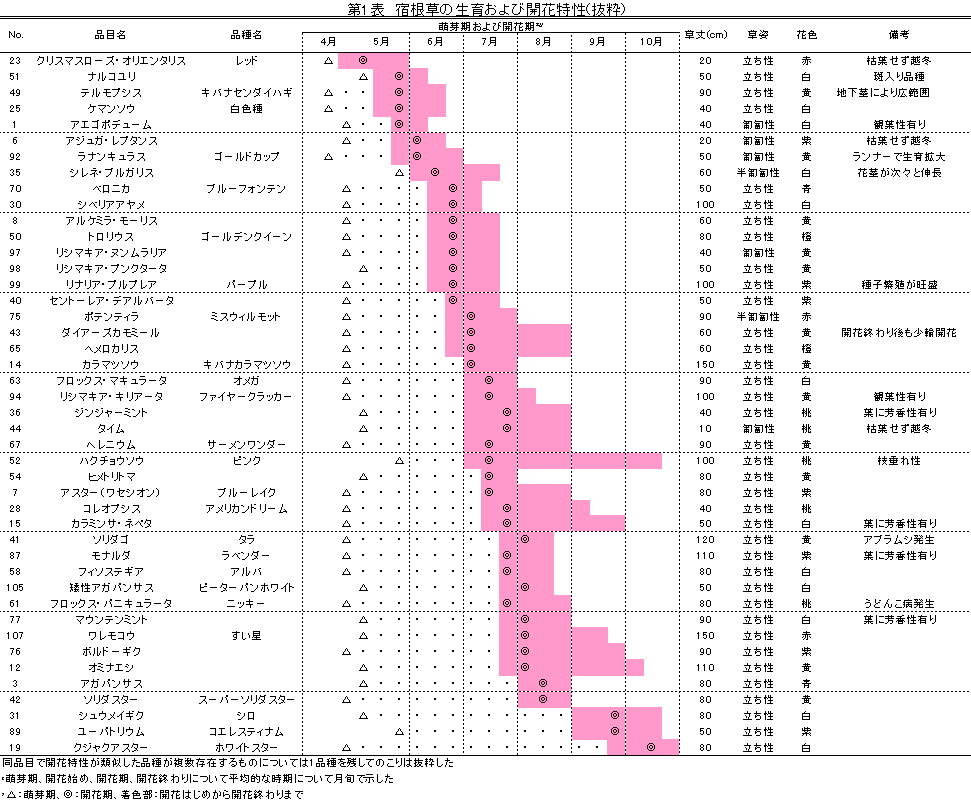 2) 生育特性については萌芽期、草丈、節数を、開花特性については開花始め、開花期、開花終わり、花茎数、花蕾数、花色を調査した。