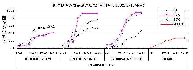 (2) 「早川系」にたいする開花促進のための処理温度は10℃が最適である。