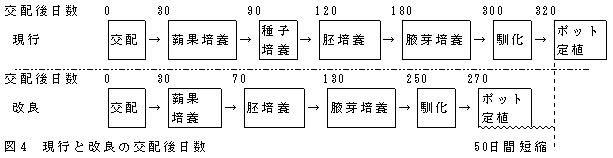 6)種子培養を省略することによって、交配からポット栽培までの期間を50日間短縮できる(図4)。ビニールハウスでポット栽培を行う場合は6月上旬までに幼苗を馴化・定植することにより翌年に圃場増殖出来うる種いもが得られる。