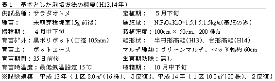温室(最低気温設定15℃)育苗、5月下旬〜10月中旬本圃栽培による成績である。