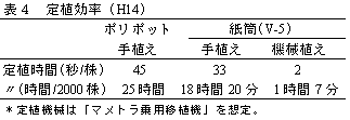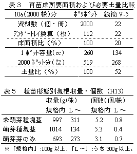 3)紙筒V-5育苗はポリポット育苗と比較して育苗床面積が20%、育苗土量が52%、定植作業時間が4%(半自動移植機使用)であり、省力かつ効率的であった(表3、4)。紙筒V-5育苗は生育、収量でポリポット育苗に及ばないが、育苗、定植の大幅な省力化が可能であった。