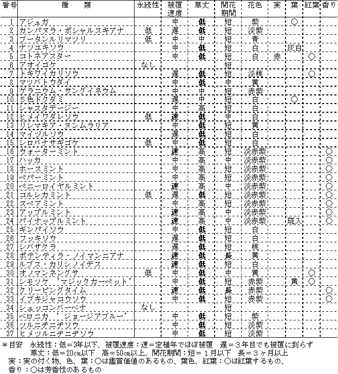 4)開花期間が長かったのは「ポテンティラ」、「クリーピングタイム」、「ヒメイワダレソウ」で2月以上であった。また葉に斑入り、葉色の変化など鑑賞価値のある品目もあった。