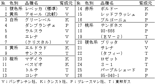 橙系では「ベスビオ」が非常に多収で、秋期収量も供試品種中最も多かった。しかし切り花品質はやや劣っていた。「マデイラ」も標準品種より多収で、花色が特徴的であった。