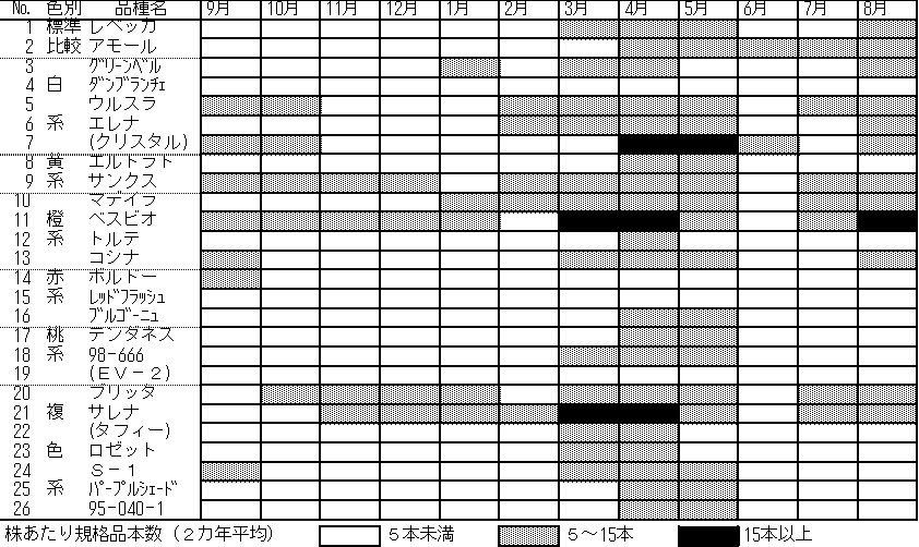 黄系では「サンクス」が多収で秋期収量も多かった。花が小輪で茎も細く、従来のタイプとは異なっていた。花色は鮮明で条線も少なく、消費ニーズに合っていると思われた。