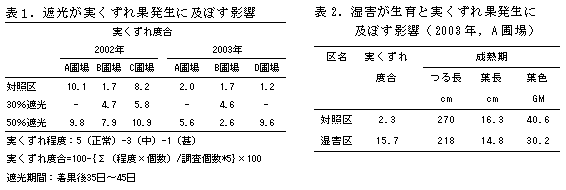 5)成熟期間の日射不足は実くずれ果発生を助長し、特に成熟後期(着果後35日頃)以降の日射が重要と考えられた(表1)。