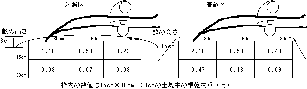 図1.高畝が根の伸長に及ぼす影響(2003年,D圃場)