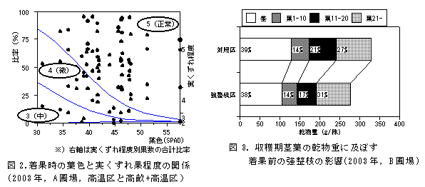8)着果前の強整枝は着果期以降の生育に悪影響を与え(図3)、実くずれ果発生を助長した。