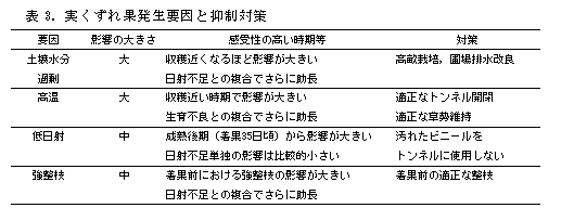 12)以上のことから、「ルピアレッド」において、収穫近い時期の高温や多雨、硬盤による根圏環境の悪化、成熟後期の日射不足、着果前の強整枝などが実くずれ果発生を助長すると推察でき、対策は高畝による根圏環境の改善と高温時の十分な換気、着果前の適正な整枝などである(表3)。