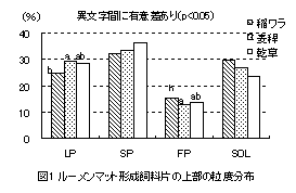 (3) ルーメンマットの一部を採取し、湿式法で粒度を分析した。ル−メン内では麦稈は稲ワラより飼料片が大きい傾向にあったが、乾草との違いは明確ではなかった(図1)。
