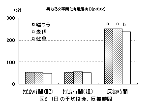 (5) 1日の採食時間は供試粗飼料間に有意な差がなく、1日の反芻時間は、麦稈および稲ワラが乾草に比べ有意に長かった(図2)。