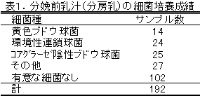 1)-(1)乳房炎起因細菌陰性を確認後、乾乳処置をしている牛群において、48頭192分房の分娩前サンプルのうち、黄色ブドウ球菌が14、環境性連鎖球菌が24、コアグラーゼ陰 性ブドウ球菌が25サンプルから検出され、乾乳期間中に乳房炎起因細菌の新たな感染 が一定割合あることが明らかとなった(表1)。