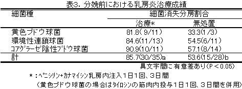 3)治療分房は無処置分房と比較して有意に(P<0.05)分娩後の細菌消失率が高いことが明らかとなった(表3)。