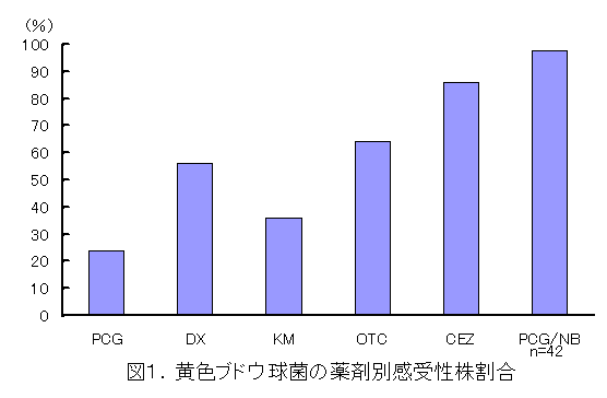 2) 潜在性乳房炎罹患牛において、抗生物質の乳房内注入と筋肉内投与の併用により75.3 %(分房)と高い治癒率が得られた(表2)。分離された同菌のペニシリン、カナマイ シンに対する感受性株割合は50%以下と低値を示した(図1)。