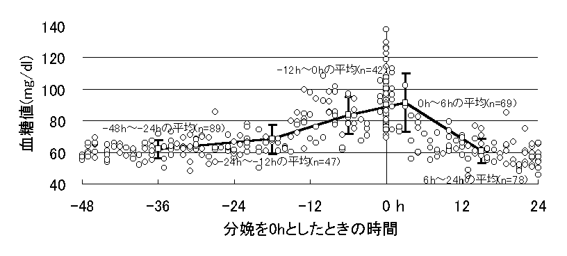 図1 分娩前後の血糖値の推移(折れ線グラフは平均値±標準偏差)