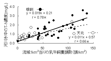 頭数との間に高い正の相関があるため、酪農が河川水質に影響を及ぼしていると考えられ