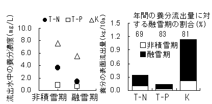 3)維持管理時の傾斜採草地における表面流出水の養分濃度は、非積雪期で高く、標準量程度の施肥でも、施肥直後にT-N30mg/Lに達した。また、融雪期の養分の表面流出量は、年間の6〜9割を占める(図2)ので、秋の集中的な糞尿散布は避けるべきである。また、緩衝帯草地の設置により、非積雪期の表面流出水のT-N濃度が低下した(図3)。