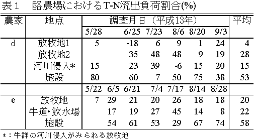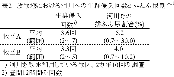 5)放牧地における水質環境負荷は、放牧地内の河川における飲水時の排泄によるものと、牧区内での排泄行為による養分負荷の偏在とに分けられた。前者では日量の平均5%(最大30%)の糞尿が排泄され(表2)、養分負荷や微生物的汚染につながる可能性があった。また後者では偏在個所として、ゲ−ト、飲水場、庇陰林などが挙げられる。