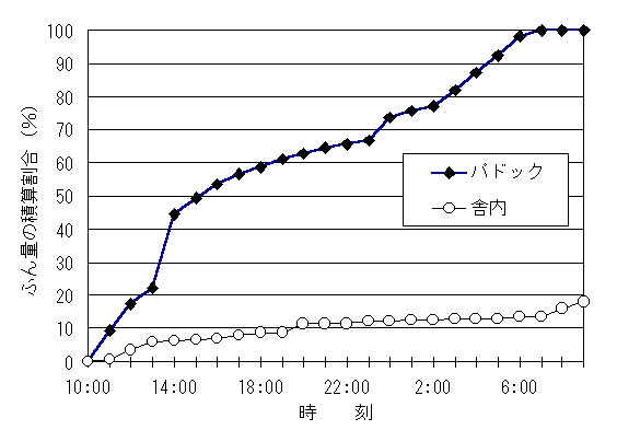 図4 パドック給与時のパドック内のふん量の積算割合(2001)