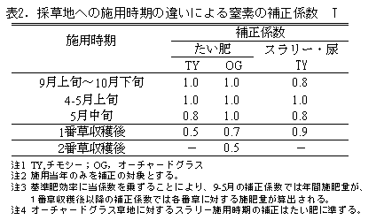 1) チモシーおよびオーチャードグラス草地では、ふん尿の肥料換算に際し、従来の基準肥効率を表1に、暫定値であったふん尿施用時期による窒素の補正係数を表2に改訂する。