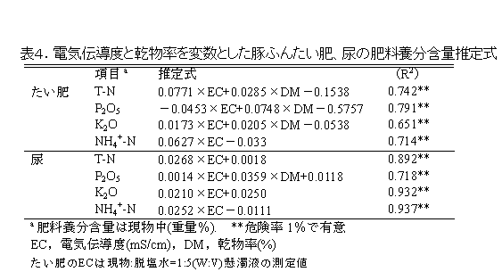 7) 豚ふんたい肥・尿の養分含量を乾物率および電気伝導度から表4によって推定できる。