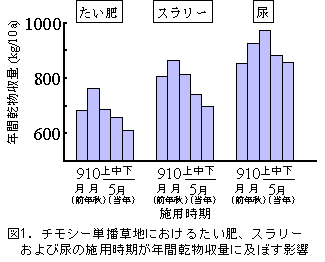 2) 草地へのふん尿の秋施用は降雪や土壌凍結等の年次変動の大きい11月以降を極力避け、10月末までに、春施用はチモシーの減収を避けるため5月中旬までに実施する(図1)。